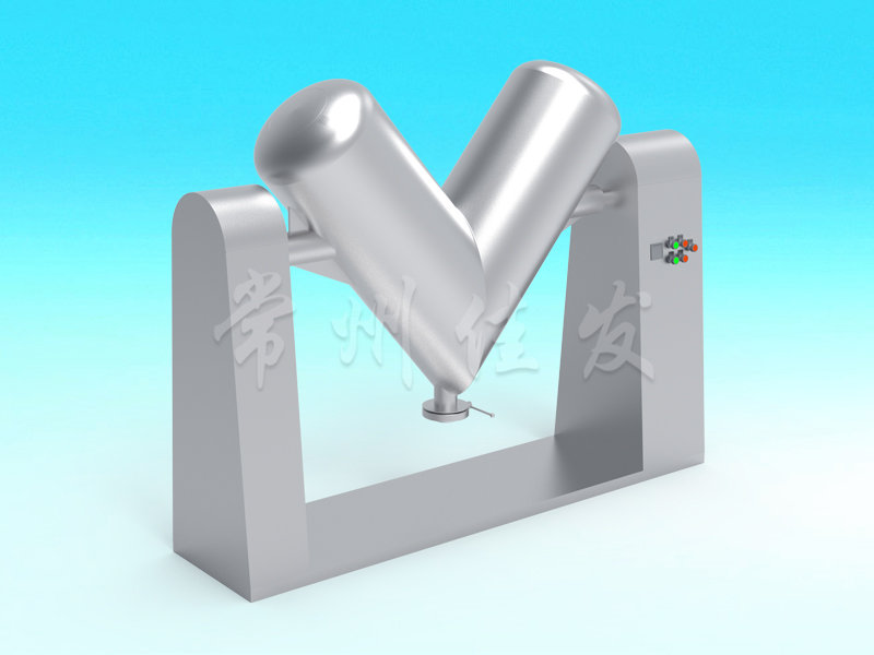 該機通過機械傳動,使不對稱的V型圓柱體內的物料做往復翻動,達到均勻混合之目的。
